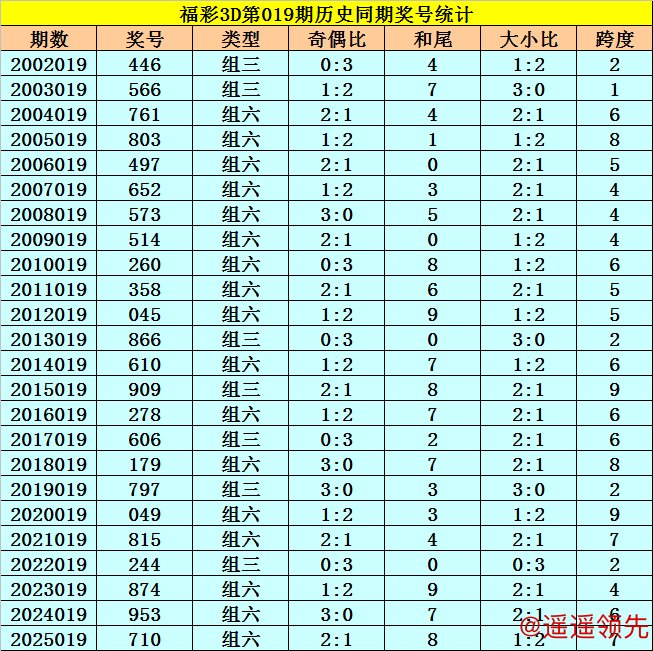 福彩3D历年第019期同期奖号为:446 566 761 803 497 652 573 514 260 358 045 866 610 909 278 606 179 797 049 815 244 874 953 710。